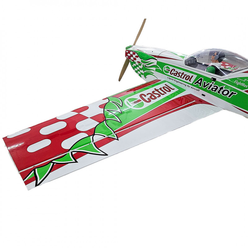 Recubierto cuidadosamente con una auténtica película termorretráctil, luce la llamativa librea Castrol Aviator para una excelente orientación y una presentación a escala real.