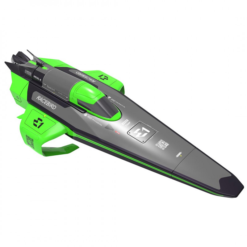 Mesurant 545 mm de longueur, 238 mm de largeur et 160 mm de hauteur, le RaceBird RC est alimenté par un moteur à refroidissement par eau de 390 et une batterie Li-Ion 7,4V 900mAh, offrant une vitesse maximale de 25 km/h.