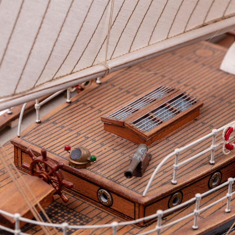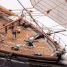 La version 2023 de cette maquette possède un nouveau manuel de montage entièrement illustré en couleurs, les roues de pompe de cale sont maintenant en laiton et reprennent exactement les formes caractéristiques de la vraie, baguettes en obechi pout réaliser le pont incluses et une nouvelle planche découpée au laser contenant des échelles et autres détails retravaillés.