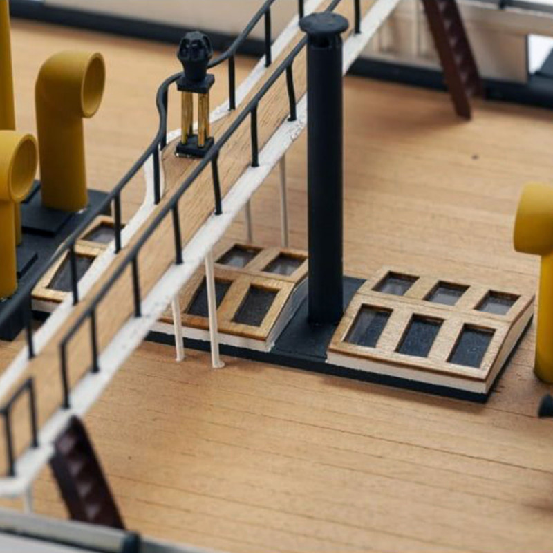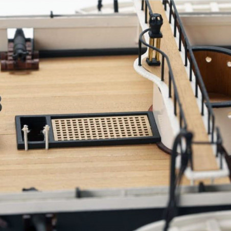 Le Warrior a été conçu et construit en réponse à un programme de construction navale française agressif qui a vu l'introduction du premier navire de guerre blindé "La Gloire" conçue par le génial architecte naval Stanislas Charles Henri Dupuy de Lomé. Le navire a subi des modifications mineures après un essai en mer. En Juin 1862, il a commencé un service actif dans l'escadron de la Manche, et il patrouillait sur les eaux côtières. Après avoir introduit une révolution dans l'architecture navale, en 1864, le Warrior a été remplacée par des navires plus rapides, avec de plus gros canons et un blindage plus épais. La boîte contient toutes les pièces en bois pré-découpées au laser et les accastillages. Echelle: 1/100. Longueur: 147cm.
