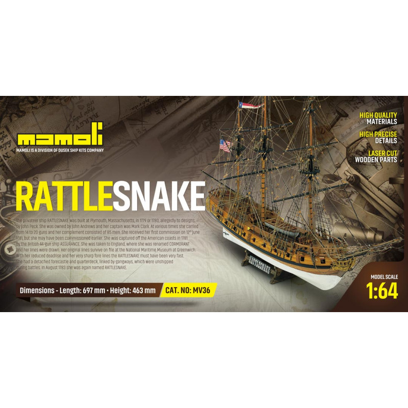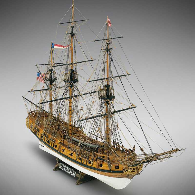 La corvette Rattlesnake fut construite à Plymouth, Massachusetts, en 1779 ou 1780, d'après les dessins de John Peck. Elle fut armée, en temps divers, de 14 à 20 canons et son équipage comptait 85 membres. Elle fut capturée au large des côtes américaines en 1781 par le navire anglais à 44 canons Assurance. Portée en Angleterre, ou lui donna le nom de Cormorant et ses lignes furent redessinées. Ayant des oeuvres mortes de dimensions réduites et des lignes de proue très affinées, la corvette Rattlesnake devait être extrêmement rapide. Elle avait gaillard d'avant et gaillard d'arrière détachés, mais reliés par des passerelles qu'on retirait pendant les combats.