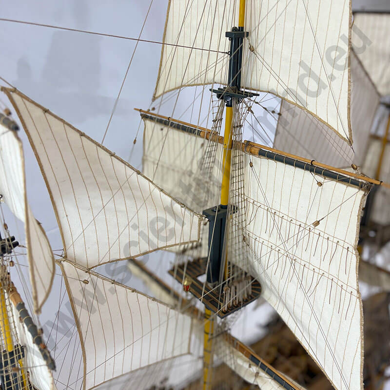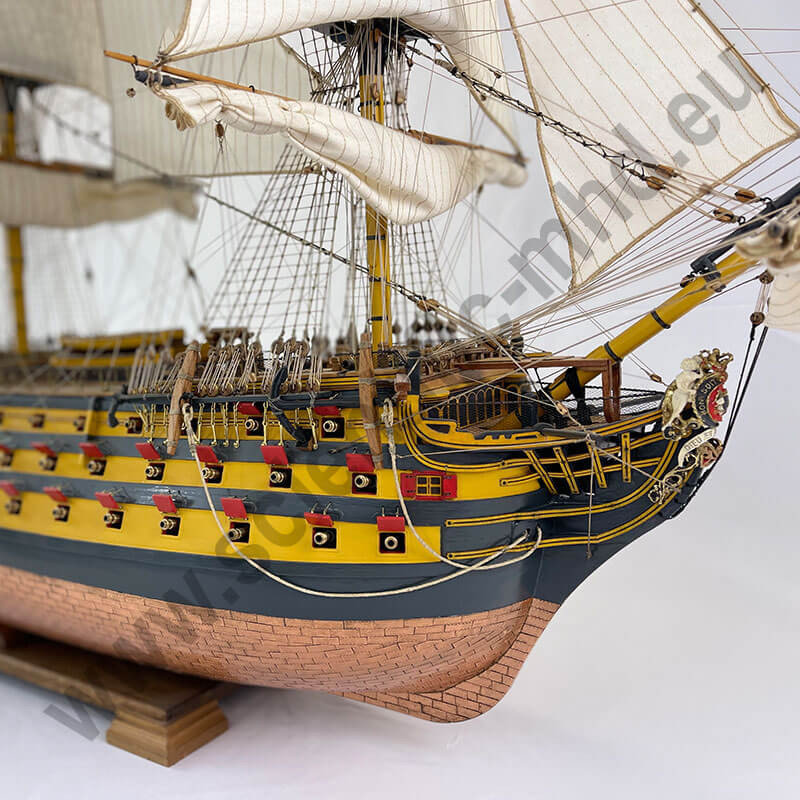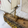 Les drapeaux sont imprimés sur de la soie véritable. Accastillage en laiton très détaillé, avec canons, lanternes, figure de proue , etc.