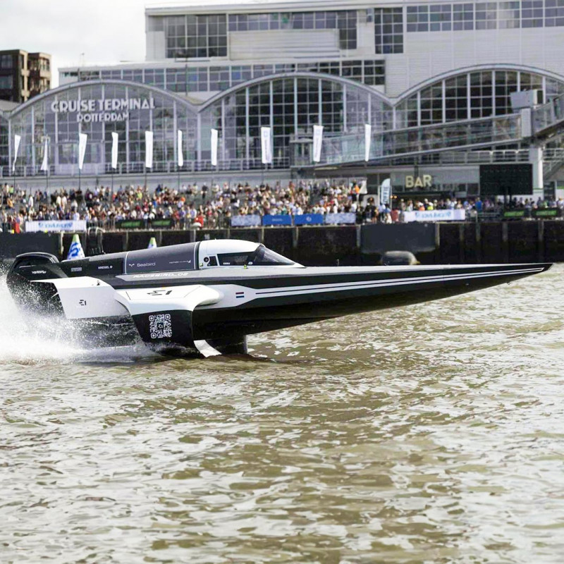 Con un peso de 800 kg, este barco totalmente eléctrico alcanza velocidades impresionantes de casi 50 nudos (93 km/h).