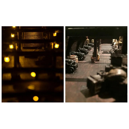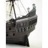 El casco está hecho de doble forro de madera, lo que garantiza un acabado cuidadoso. Las decoraciones metálicas, las linternas, los cañones y los elementos del puente refuerzan la apariencia realista del modelo. El aparejo completo con mástiles, vergas y cuerdas permite obtener un barco fiel al original.