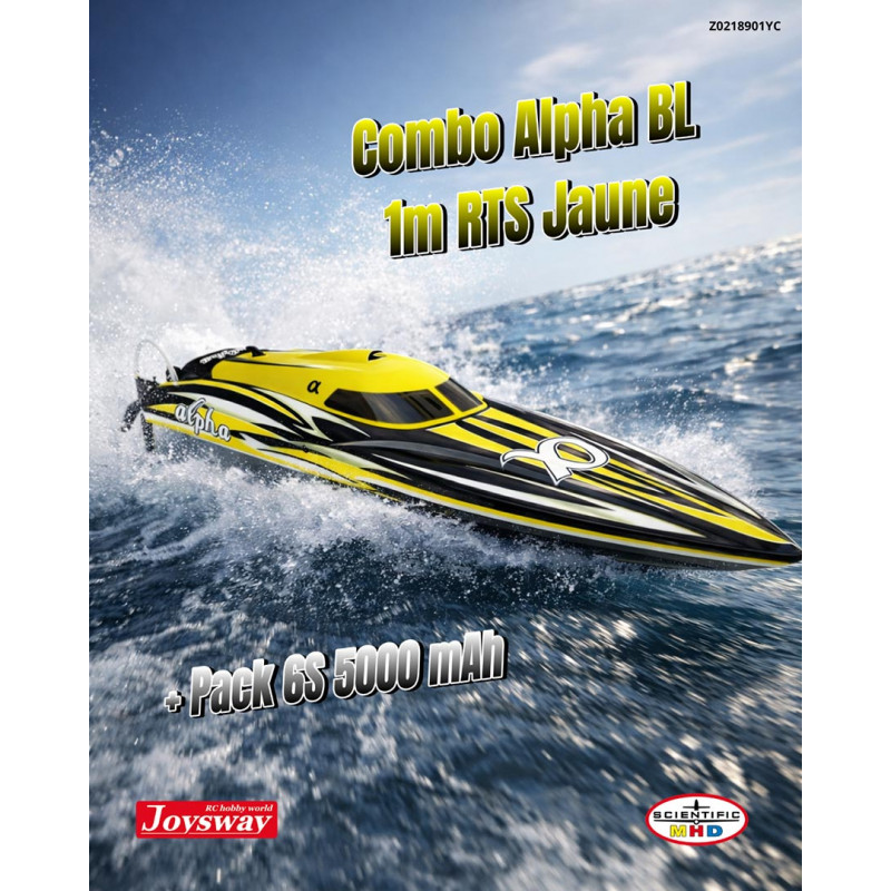 Equipamiento en 6S del barco teledirigido ALPHA: Se deberá montar en el eje de la hélice la hélice grabada 6S.Atención a respetar la elección de la hélice adecuada según las baterías elegidas para evitar daños graves en el motor y el variador.El cargador para las baterías no está incluido y debe adquirirse por separado.Longitud del casco: 950 mm, longitud total del barco 1060 mm.Peso sin batería 2,6 kg.Se entrega en amarillo y negro bajo esta referencia.