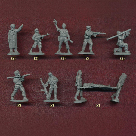 Las cajas generalmente contienen varias decenas de figuras con diferentes poses (combate, marcha, disparo, comando), lo que facilita la creación de escenas realistas.