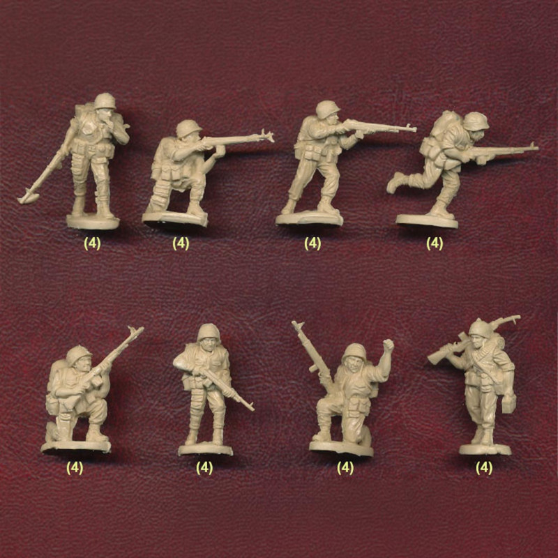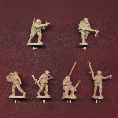 Las cajas generalmente contienen varias decenas de figuras con diferentes poses (combate, marcha, disparo, comando), lo que favorece la creación de escenas realistas.
