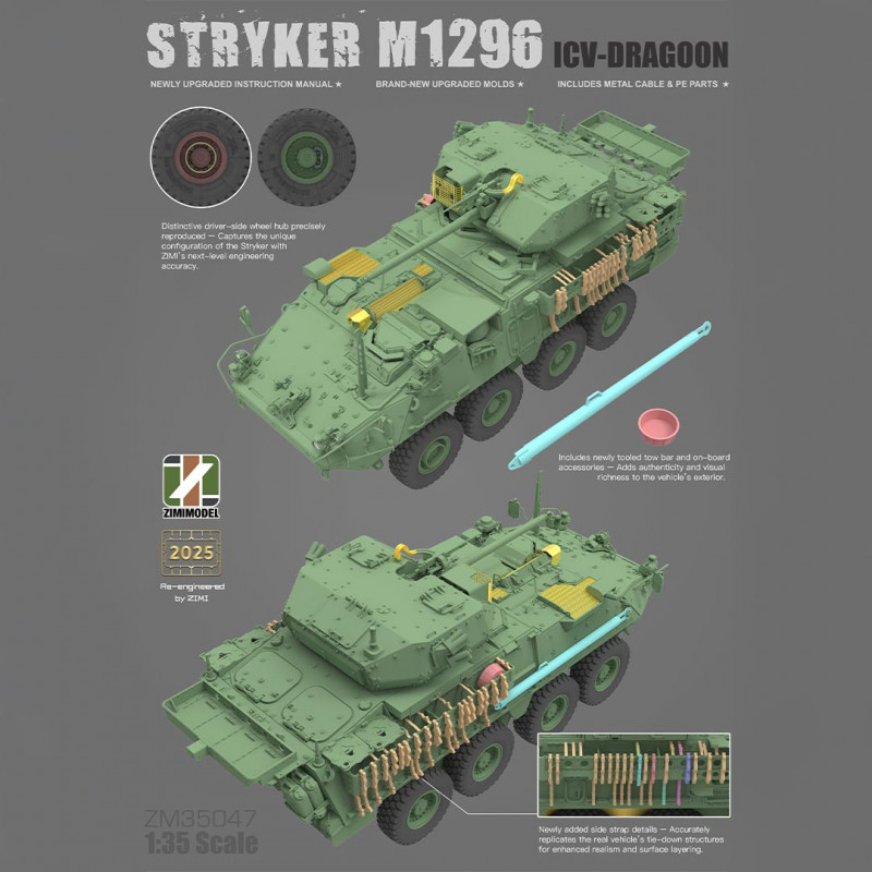 Zimi Model ha actualizado los moldes y añadido nuevas piezas a su kit Stryker para producir este Stryker M1296 ICV-Dragoon con mejora ESA MWO.