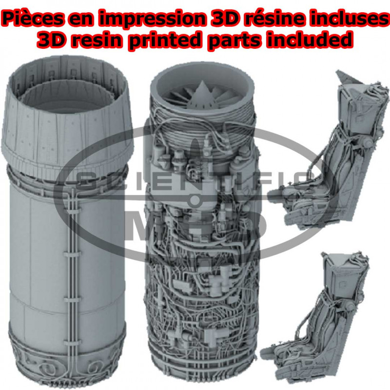 Dernière version 2024 de la maquette améliorée avec un set de pièces en résine incluant les 2 sièges des pilotes, le réacteur et sa tuyère très finement détaillés.