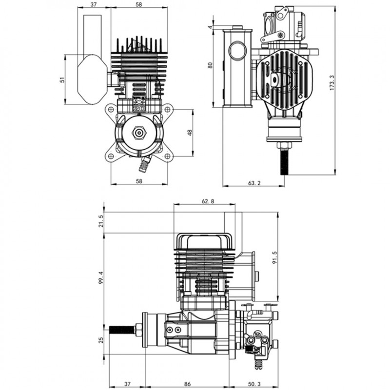 • Un motor X-20cc-S de escape lateral con su carburador Walbro
