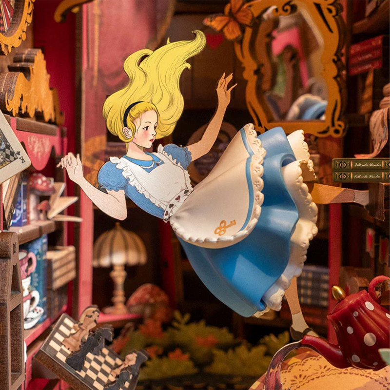 Monta tú mismo este nuevo Rincón de Libros de las Aventuras de Alicia. La parte frontal adopta la forma de un gran tronco de árbol, cuya base está formada por escalones en forma de tocón. En la parte superior, una abertura en forma de cerradura revela los misterios del interior. En lo que parece un estanque interior, se descubren platos decorativos, marcos de cuadros y sorpresas ocultas, como el espejo infinito. Hay setas excéntricas, libros antiguos, juegos de mesa y una profunda cita: «La imaginación es el arma en la guerra contra la realidad». Demuestre su sentido del humor y su curiosidad con este sujetalibros único.