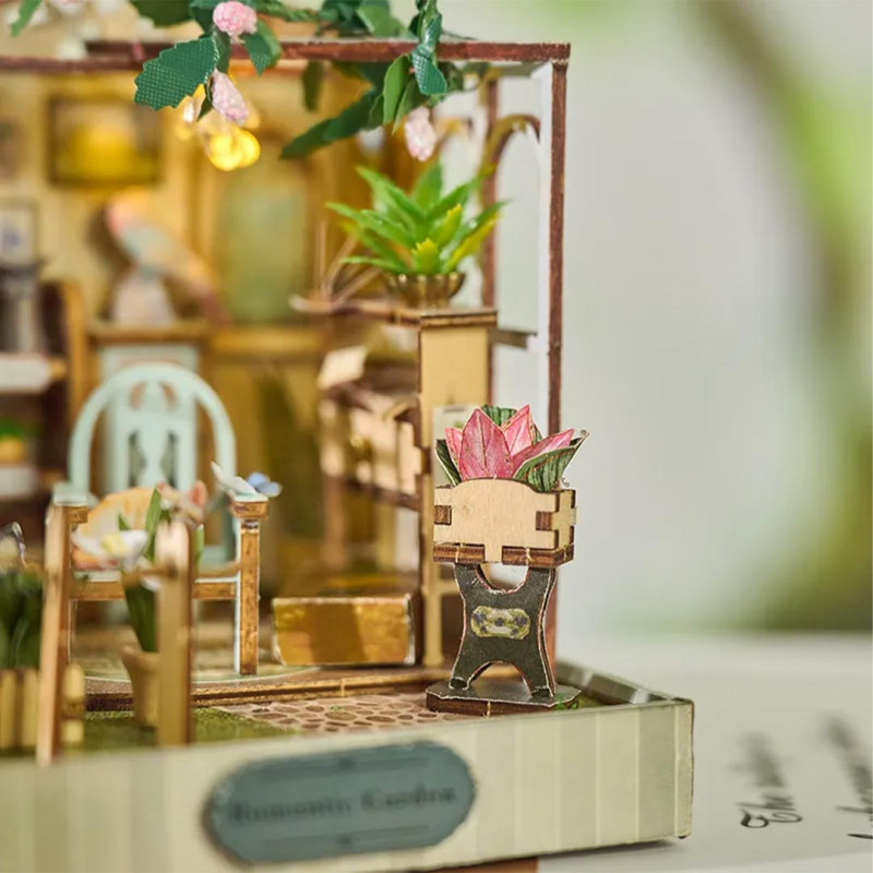 FLOWER TIME ARTS, sujetalibros (Book Nook) principalmente de madera para montar uno mismo (Do It Yourself), mediante encaje y pegado.