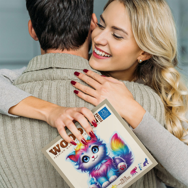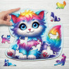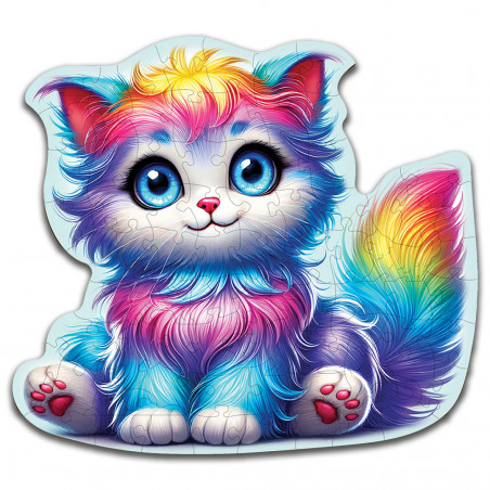 Descubra el Fantasy Kitty Puzzle de Madera Animales 75 piezas, una experiencia fascinante que da vida a un gato lleno de vibrantes colores del arcoíris.