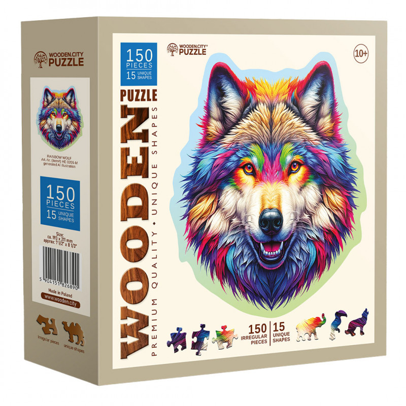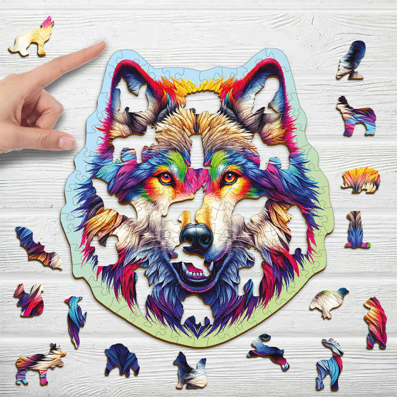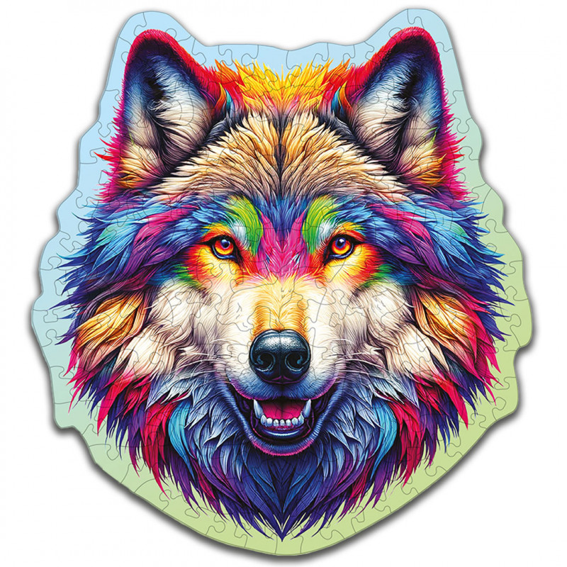 Descubra el lobo Arcoíris Soñador Puzzle de Madera Animales 150 piezas, una experiencia fascinante que da vida a un lobo lleno de vibrantes colores del arcoíris.